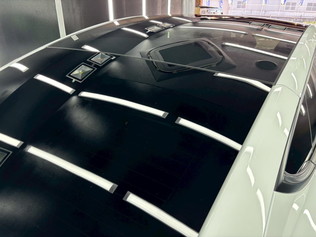 フロントとルーフには G’zoxガラス撥水コーティング を施工。雨天時でも水滴がスムーズに流れ落ち、ドライブ時の視界が格段に向上します。Teslaの大きなガラスエリアを持つルーフには特に効果的で、日常の快適さと安全性をサポートします。
