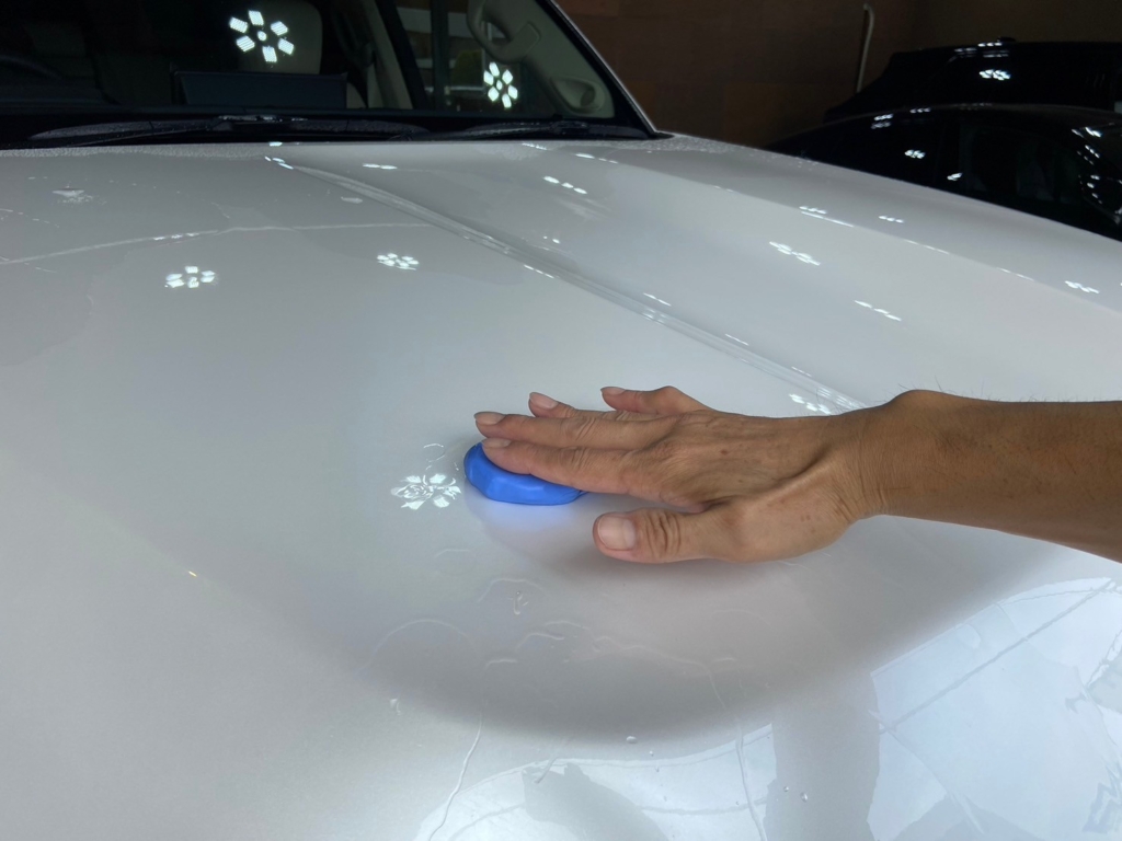 駐車・走行時に付着して紫外線の影響でボディに侵食してしまった鉄粉をトラップ粘土で撫でて絡め取り除去していきます。