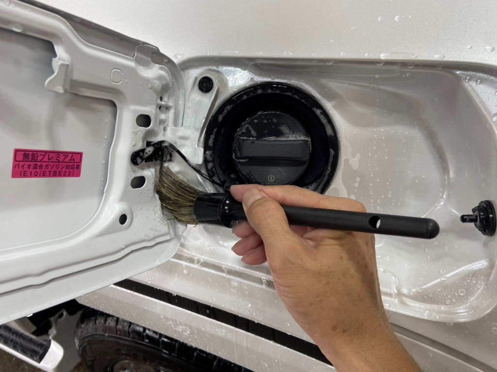 刷毛を使い、グリル周りや給油口カバーの中も洗浄していきます。