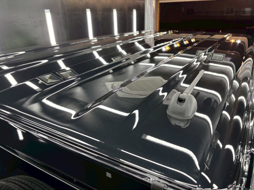施工後の黒は鏡のように光を返し、車体のラインがくっきり。