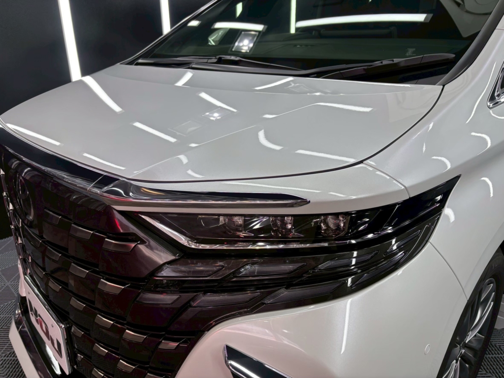 白のアルファードでも、ボンネットやサイドパネルに深い光沢が生まれ、立体感がはっきりと出ました。